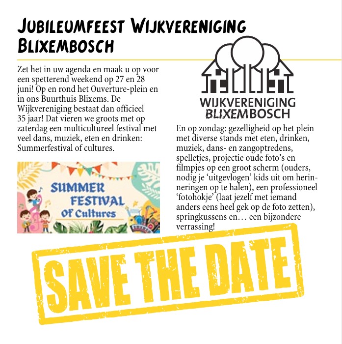 Daarnaast wordt er in datzelfde weekend op zaterdag vanuit het wijkcentrum Blixems ook een evenement georganiseerd, een culturele manifestatie zoals vorig jaar juni: Summerfestival of cultures. Het wordt dus een dubbel-feest op 27 en 28 juni. We zullen u de komende tijd nader informeren over beide activiteiten.